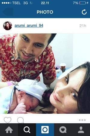 Arumi (21) baru saja mengunggah gambar bayi laki-lakinya di jejaring sosial Instagram. Arumi yang terlihat masih lemas, berpose di ranjang sambil mendekap sang bayi ditemani sang suami.