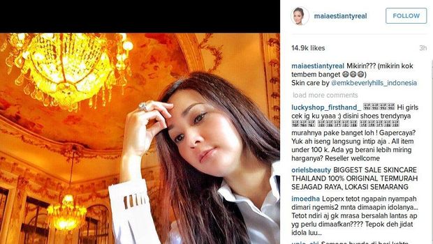 "Mikirin??? (mikirin kok tembem banget) Skin care by @emkbeverlyhills_indonesia," tulis Maia.