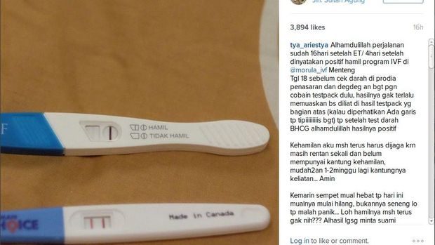 "Alhamdulillah perjalanan sudah 16hari setelah ET/ 4hari setelah dinyatakan positif hamil program IVF di @morula_ivf Menteng. Tgl 18 sebelum cek darah di prodia penasaran dan degdeg an bgt pgn cobain testpack dulu, hasilnya gak terlalu memuaskan bs diliat di hasil testpack yg bagian atas (kalau diperhatikan Ada garis tp tipiiiiiiiiis bgt) tp setelah test darah BHCG alhamdulillah hasilnya positif," tulis Tya dalam akun Instagram miliknya.