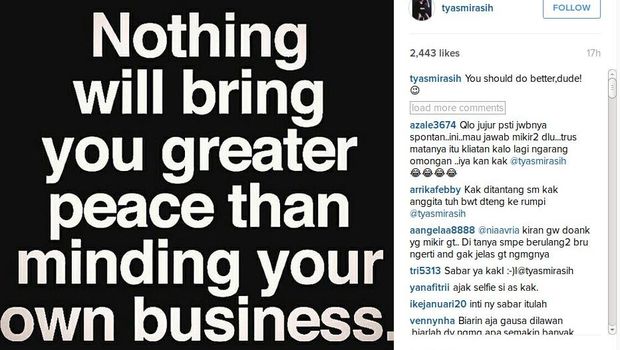 "Nothing will bring you greater peace than minding your own business," tulis Tyas.