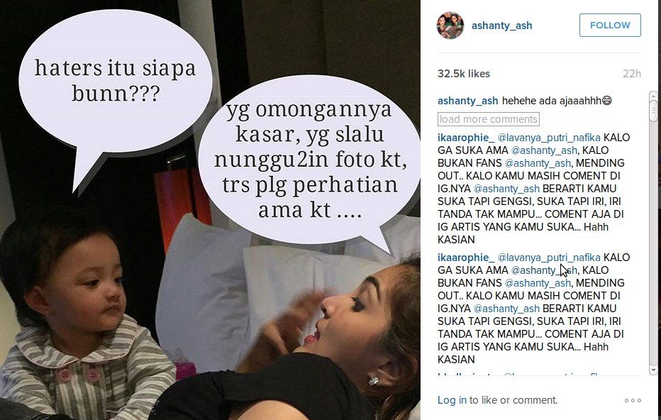 "Jangan hiraukan bun hater.. ga ada alasan mereka bulshitt.. maju terus ya bun.sayangi mas anang dan anak2 semua.. semangat.. cayo cayo," komentar mendukung yang datang dari follower Ashanty.