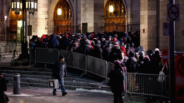Ribuan fans memadati acara penghormatan terakhir untuk Rene yang terbuka untuk publik di Notre-Dame Basilica, Montreal, Canada pada Kamis (21/1) waktu setempat. Nampak para penggemar berbaris rapi untuk melihat wajah manajer sekaligus suami dari Celine tersebut untuk yang terakhir kalinya.