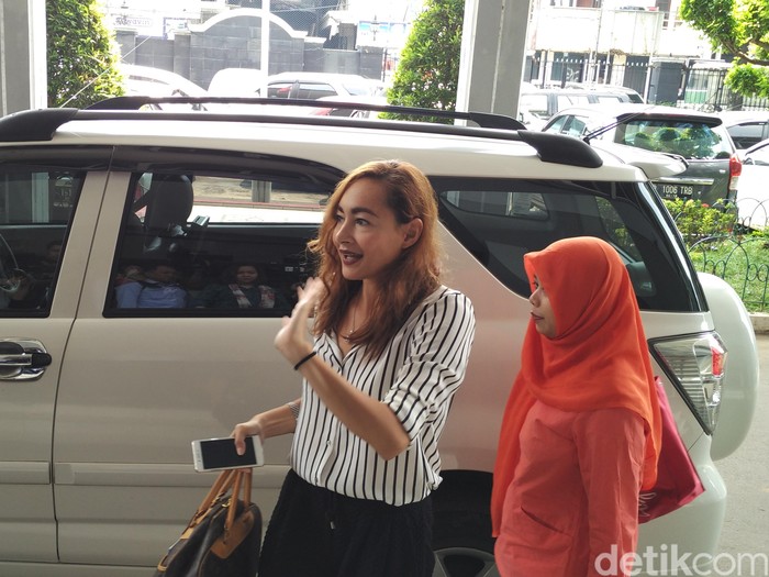 Dewi menginjakkan kakinya di PN Jaksel sekitar pukul 12.35 WIB. Ia nampak cantik dengan mengenakan baju bergaris hitam dan putih.