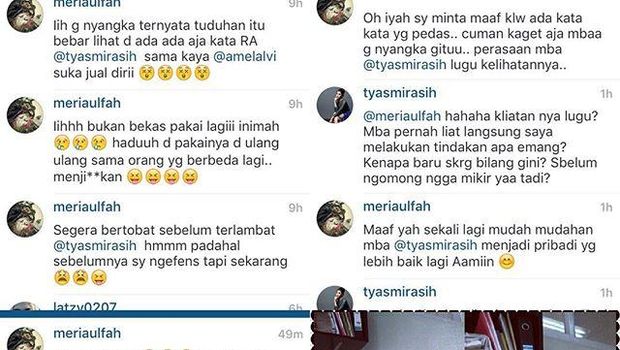 Salah satunya dari akun meriaulfah di Instagram. Sang pemilik yang sepertinya perempuan memberikan komentar pedas untuk Tyas pada Kamis (12/5/2016). "Segera bertobat sebelum terlambat @tyasmirasih hmmm padahal sebelumnya sy ngefens tapi sekarang," tulis meriaulfah.