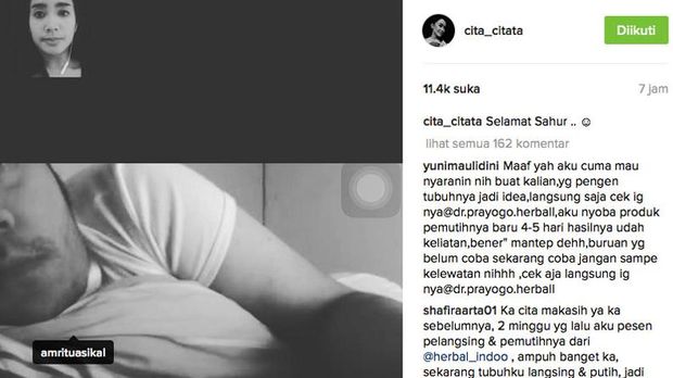 Menengok akun Instagram milik Cita Citata, ia mengucapkan selamat sahur untuk sang pacar melalui aplikasi video Facetime. Video Facetime itu kemudian dicuplik dan diunggah di akun jejaring sosialnya tersebut.