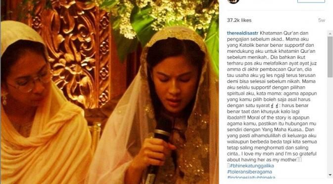 "Mama aku yang Katolik benar benar supportif dan mendukung aku untuk khatamin Qur'an sebelum menikah.. Dia bahkan ikut terharu pas aku melafalkan ayat ayat juz amma di akhir pembacaan Qur'an, dia tau usaha aku yg les ngaji terus terusan demi bisa selesai sebelum nikah," katanya.