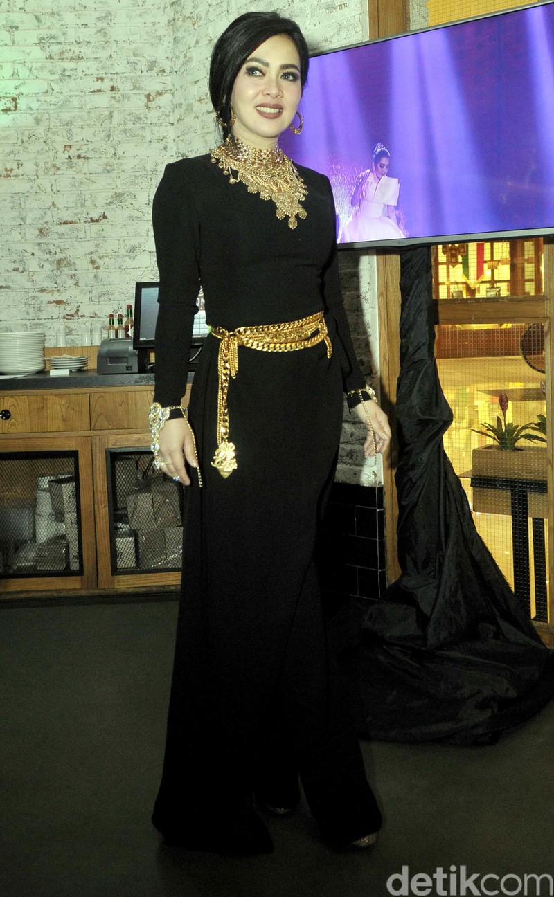 Syahrini tampil dibalut dress hitam yang disentuh dengan warna emas dari Hengki Kawilarang. Pool/Noel/detikFoto.