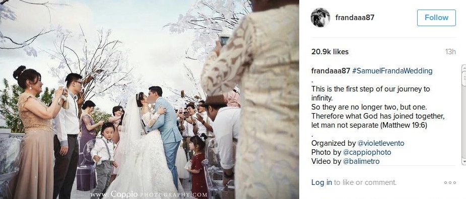 "#SamuelFrandaWedding. This is the first step of our journey to infinity. So they are no longer two, but one. Therefore what God has joined together, let man not separate (Matthew 19:6)," tulis Franda dalam akun Instagramnya.