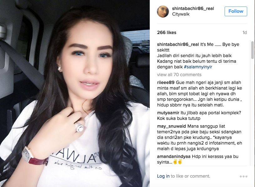 Bintang 'Kawin Kontrak' (2013) itu nampak memamerkan rambutnya yang hitam dan panjang, disertai tulisan yang menggambarkan dirinya sekarang. "It's Me ...... Bye bye sakittt. Jadilah diri sendiri itu jauh lebih baik. Kadang niat baik belum tentu di terima dengan baik #salamnyinyir," tulis Shinta dalam caption fotonya di Instagram.