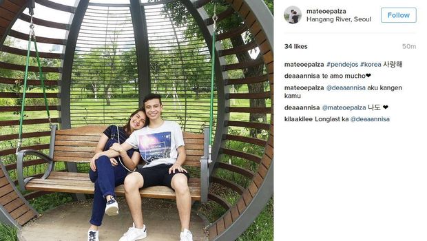 "Aku kangen kamu @deaaannisa," tulis @mateoepalza dalam sebuah unggahan dimana mereka berdua sedang duduk di sebuah ayunan. Dea kemudian membalas dengan bahasa Korea disertai simbol hati.