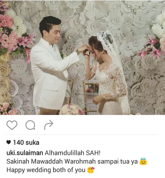 "Alhamdulillah sah. Sakinah Mawadah Warohmah sampai tua ya. Happy Wedding both of you," ujar Uki dalam akun Instagram @uki.sulaiman, Rabu (2/11/2016).