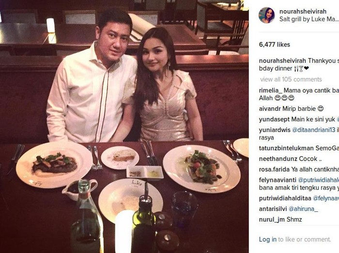 'Thankyou sayang for the bday dinner' tulisnya dalam salah satu foto yang ia unggah. Mengenakan warna yang baju senada dengan suami, Nourah terlihat cantik dan menawan.