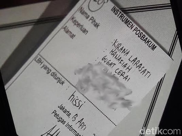 Di kertas kecil itu terlihat tulisan nama lengkap ibu satu anak itu, yakni Kirana Larasati Hanafiah. Pada kolom keperluan, bintang sinetron itu menulis gugat cerai.