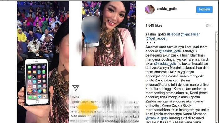 "Selamat sore semua nya kami dari team endorse @zaskia_gotix sekaligus pemegang akun zaskia Ingin klarifikasi mengenai postingan yg kemaren ramai di akun @zaskia_gotix itu bukan kesalahan dari zaskia nya Melainkan kesalahan dari team endorse ZASKIA,yg tanpa sepengatuhan Zaskia sudah mengedit photo Zaskia,dan kami (team endorse)Kurang teliti dengan game online kartu itu sehingga Kami (team endorse) memposting promo akun itu," begitu tulis admin yang memegang akun Instagram Zaskia Gotik, seperti dilihat detikHOT, Senin (22/5/2017).