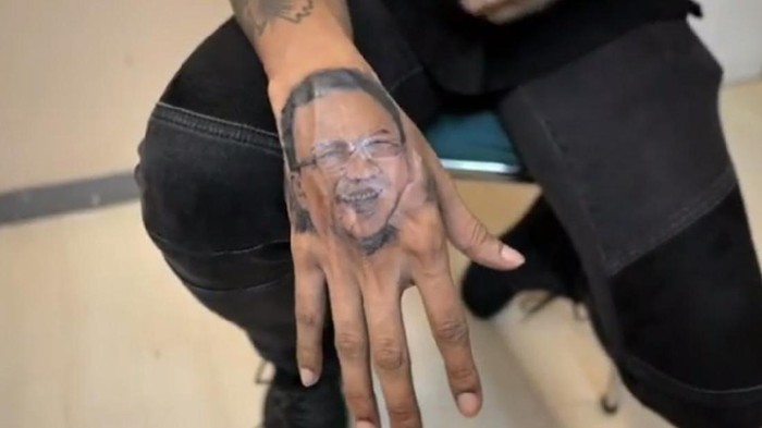 Tak disangka, ternyata ia juga menggambar sebuah wajah di telapak tangannya. "Tapi ada perbedaannya, ini permanen dan nggak bakal hilang," ujarnya sambil menghapus tato wajah Ahok.