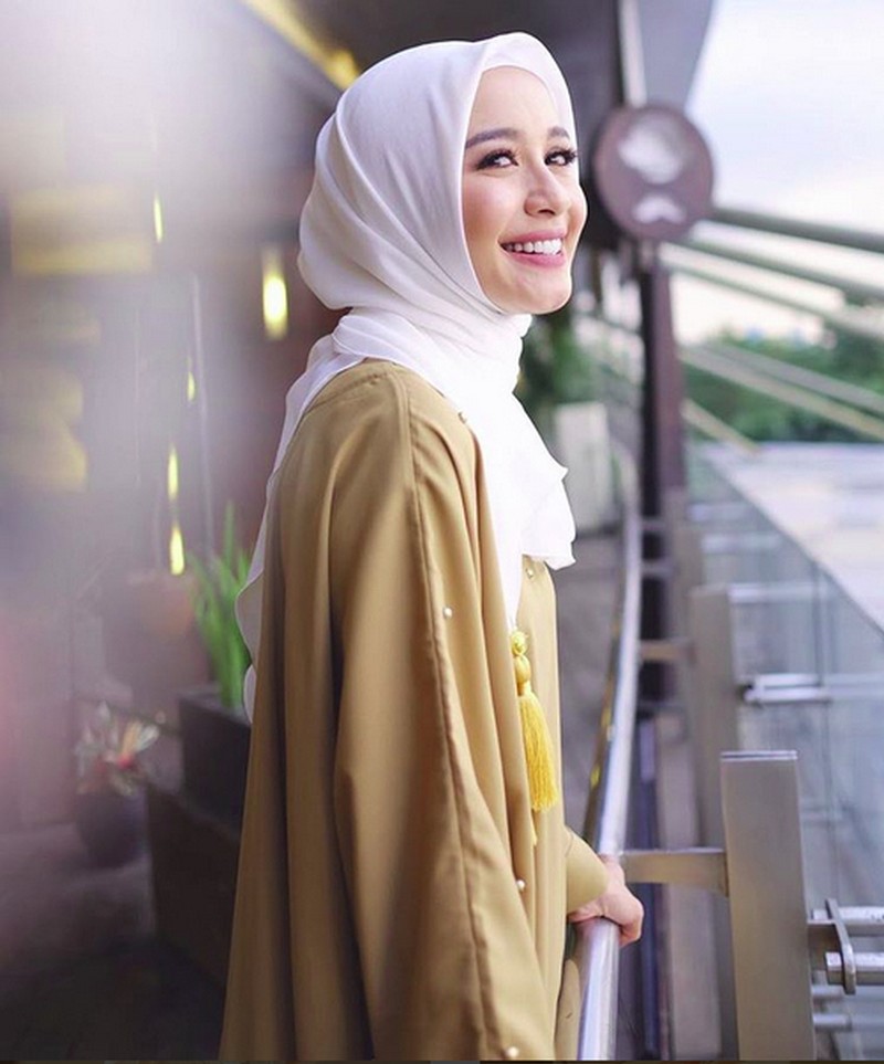 Mengenakan baju muslim warna cokelat muda kombinasi kuning, Laudya Cynthia Bella terlihat cantik. Foto: Instagram Laudya Cynthia Bella