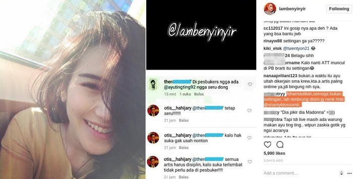 Petinggi ANTV, Otis Hahijary memastikan bahwa Ayu Ting Ting sudah didepak dari acaranya. Tapi yang terjadi malah banyak yang bersyukur dengan berkomentar "alhamdulillh smg bkn settingan,". Perlu dicatat ini adalah dua potongan gambar dari laman Ayu dan akun gosip. Foto: Instagram/ayutingting/lambenyinyir