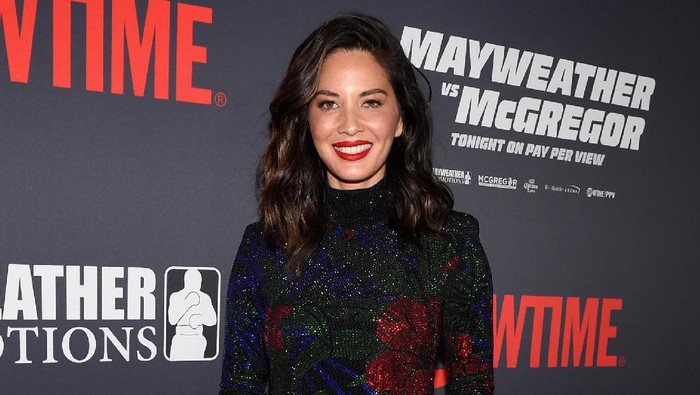 Olivia tampil mengenakan gaun mini Balmain berkilau dengan sepatu Saint Laurent. Bintang 'X-Men: Apocalypse' itu tampil mesra dengan Jamie, sementara sang aktor merangkul pinggulnya.