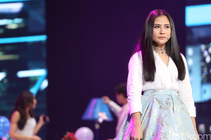 Jakarta - Prilly Latuconsina tampak happy saat mengisi acara Vivo V7+ di Kemayoran. Dengan dress putih-biru, ia terlihat cantik memesona.