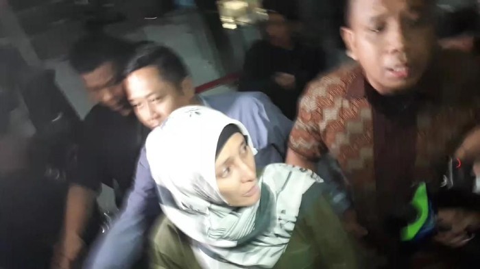 Tak sepatah katapun diucapkan Inneke yang mengenakan hijab putih. Dia hanya berjalan gontai melewati wartawan yang telah menantinya.