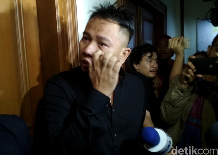 Vicky Prasetyo tiba dengan menggunakan mobil hitam dan kemeja hitam. Sambil menangis, ia terus berjalan dengan didampingi oleh pengacaranya.