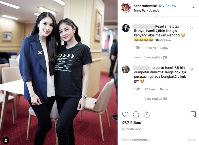Jakarta - Sandra Dewi yang tengah hamil 7 bulan lebih berpose bersama Dewi Perssik. Penampilan keduanya pun mendapat sorotan netizen, seperti apa komentar mereka?