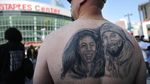 Banyak fans Kobe Bryant dan yang hadir dengan mengenakan kostum kelab basket LA Lakers.Β Getty Images/Mario Tama