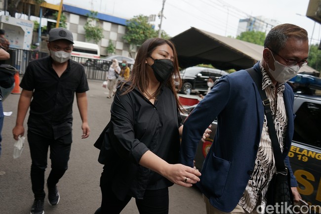 Wina Natalia tampil dengan busana serba hitam saat mendatangi Polres Jakarta Barat. Foto: Palevi/detikhot