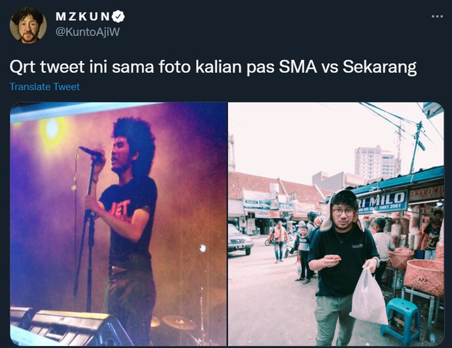 Berawal dari Kunto Aji yang nimbrung ke cuitan salah satu rekannya di Twitter, para musisi ini membagikan foto masa SMA mereka. Begini penampilan Kunto Aji saat di panggung dulu dan sekarang. (Foto: dok. Tangkapan layar Twitter)