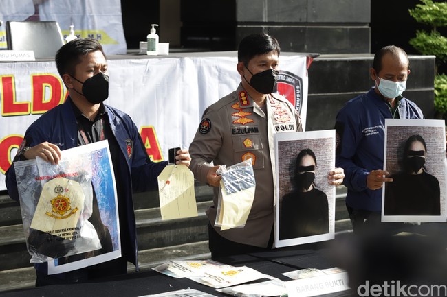 Polisi saat perilisan kasus prostitusi artis CA yang disebut Cassandra Angelie di Polda Metro Jaya pada Jumat (31/12). Pool/Palevi S/detikFoto