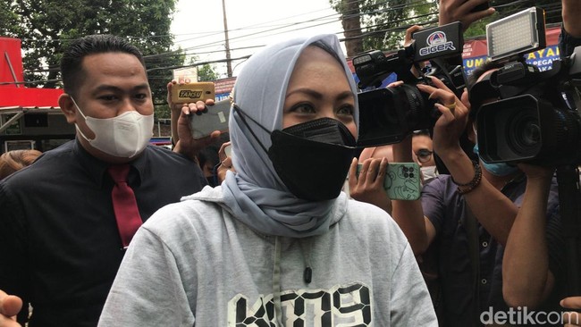 Angelina Sondakh menggunakan jaket berwarna abu-abu dengan kerudung yang senada. Ia ditemani oleh beberapa orang untuk wajib lapor.