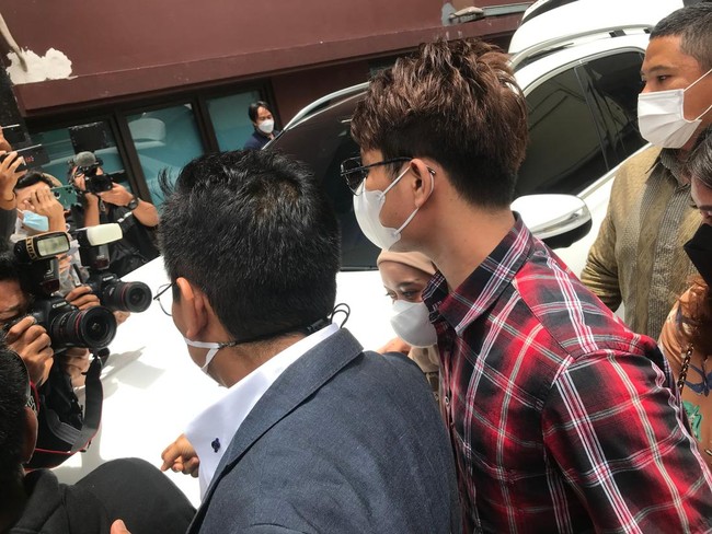 Rizky Billar dan Lesti Kejora didampingi oleh kuasa hukumnya, Sandy Arifin. Rizky Billar terlihat tegang ketika dicecar pertanyaan oleh awak media.