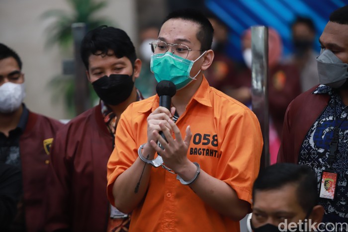 Penampilan Indra Kenz saat dipamerkan polisi ke publik. Foto: Palevi/detikhot