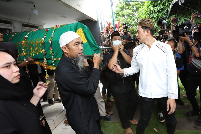 Kiki Farrel menggotong keranda berisi jenazah Mama Dahlia menuju ke masjid. Foto: Palevi/detikcom