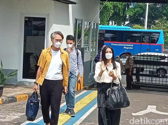 Nirina Zubir tiba di Pengadilan Negeri Jakarta Barat didampingi Ernest, sang suami dan kuasa hukumnya pada Selasa (17/5/2022). Foto: Ahsan/detikHOT