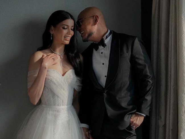 Deddy Corbuzier tampak gagah dengan setelan jas berwarna hitam. Di sampingnya, Sabrina Chairunnisa begitu anggun dengan kebaya berwarna pink.
