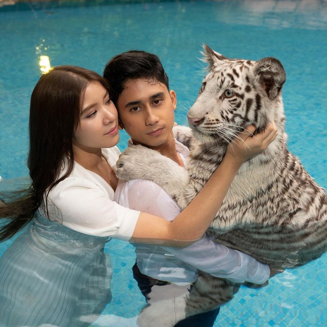 Jakarta - Tiara Andini bersama Alshad Ahmad sedang berada di kolam renang ditemani seekor harimau putih bernama Selen. Mereka sepertinya sedang kolaborasi bikin konten.
