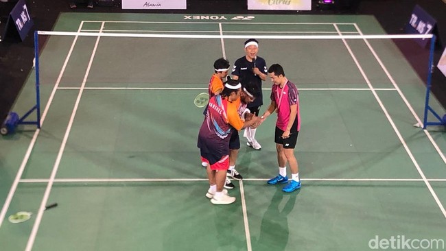 Sempat ada momen lucu saat mereka melakukan pemanasan. Beberapa kali baik Marshel, Indra Jegel dan Rigen terlihat kesulitan untuk mengembalikan kok dari Taufik hingga akhirnya berhasil memberikan smash.