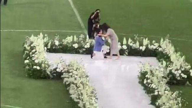 Sang atlet mengajak Valencia Tanoesoedibjo berjalan ke tengah lapangan melewati jalur yang sudah dibuat itu. Di tengah lapangan JIS, Kevin Sanjaya berlutut dan melamar Valencia.