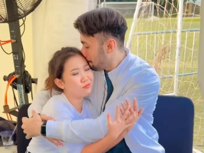 Kiky Saputri yang terlihat tidak bersemangat dihampiri oleh Refal Hady. Refal Hady yang memakai jaket putih langsung memeluk dan mencium kepala Kiky Saputri.