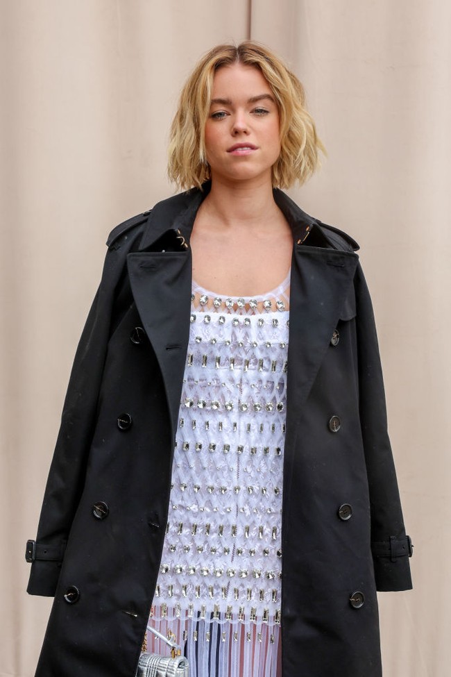 Milly Alcock tampil dengan dress dominan putih yang awalnya dibalut coat hitam. (Foto: Dave Benett/Getty Images for Burberry)