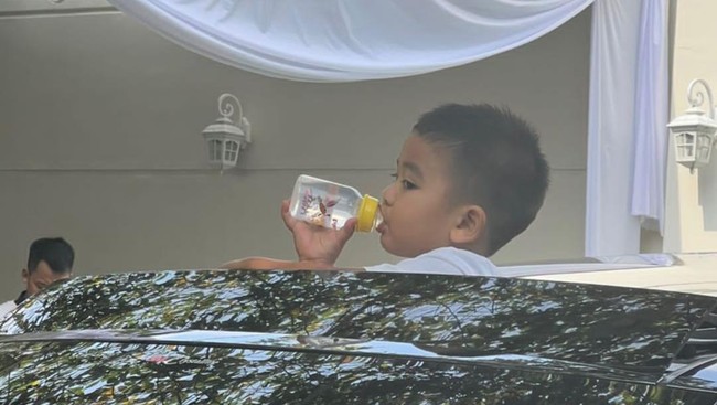 Erina Gudono juga memperlihatkan Al Nahyan tanpa beskap berjalan di samping Jan Ethes dan Sedah Mirah. Bocah yang dijuluki 'Ketua dari Medan' itu memang beda, Jan Ethes dan Sedah mirah memakai seragam pernikahan jelang akad Kaesang dan Erina, Al Nahyan nyaman dengan kemeja biru dan celana sebetis berwarna putih.
