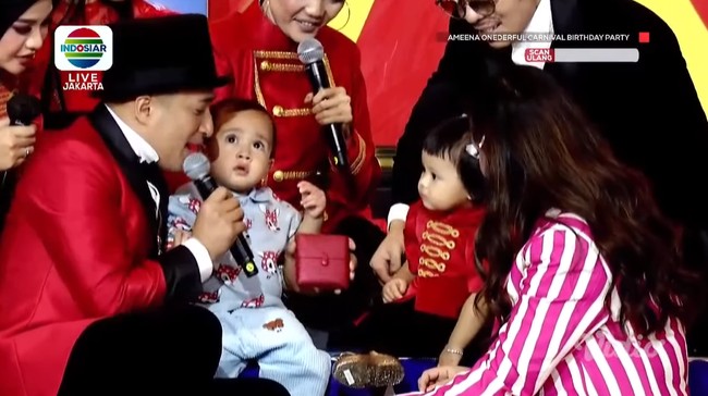 Terlebih ketika Cipung ditemani oleh Nagita Slavina naik ke panggung dan memberi kado buat Ameena. Kado itu dibungkus dalam kotak berwarna abu-abu lengkap dengan kartu ucapan.