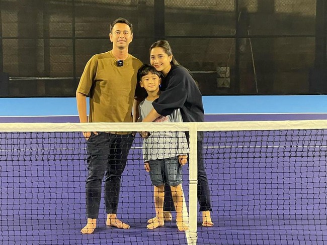 Terlihat dalam foto itu, Raffi Ahmad, Nagita Slavina, dan Rafathar berfoto bersama di lapangan dengan lantai berwarna biru tersebut.