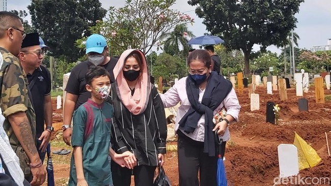 Bukan hanya itu saja, istri Iqbal Pakula, Andiez La' Nuite juga tampak hadir di pemakaman. Ia menggunakan kerudung dan kacamata hitam.