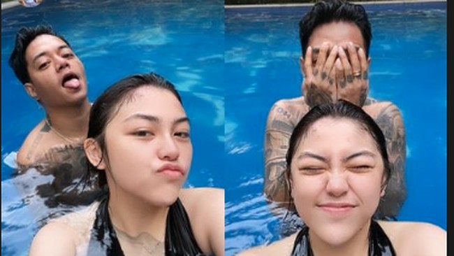 Pada foto kolase itu, tampak wanita yang dikenal karena kariernya di JKT48 tersebut berpose bersama Reza Arap. Mereka selfie di dalam kolam renang.