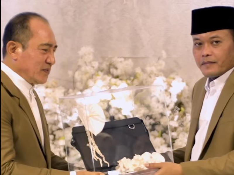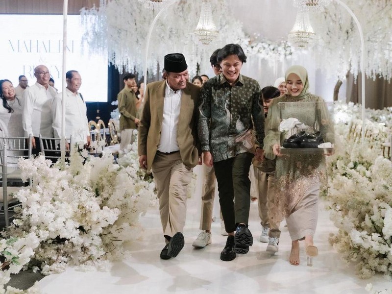Momen ketika Sule memberikan simbolis seserahan kepada calon besan, ayahanda Mahalini. Kali ini wajah Sule terlihat lebih serius ke arah kamera. Foto: dok. Instagram