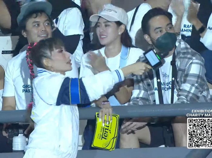 Jeje dan Syahnaz terlihat duduk berdampingan di bangku penonton saat melihat pertandingan Lagi Lagi Tenis di Istora Senayan, Jumat (23/6/2023). Jeje yang memakai masker tampak mengenakan kemeja flanel sebagai outer dipadu dengan kaus putih. Sedangkan Syahnaz duduk di sampingnya memakai topi putih. Foto: dok. Instagram dan YouTube RANS Entertainment.