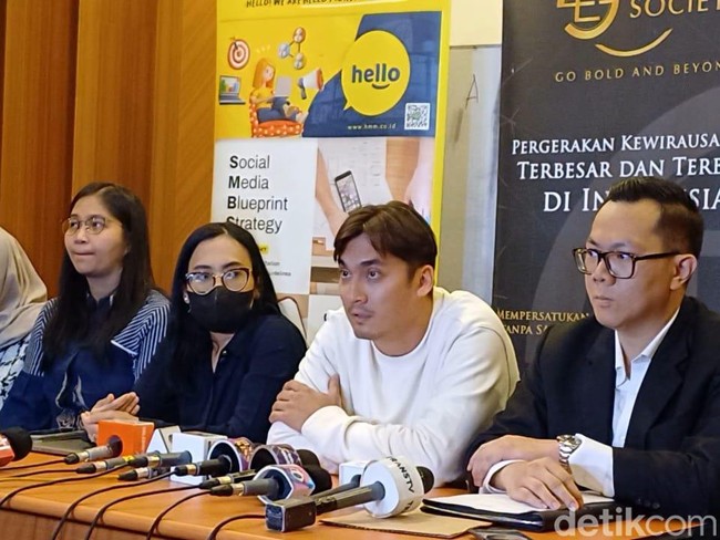 Rendy Kjaernett menggelar konferensi pers di kawasan Cideng, Gambir, Jakarta Pusat pada Sabtu (1/7/2023). Dia ditemani oleh beberapa orang kuasa hukumnya. Meski dicecar pertanyaan soal benar atau tidak adanya perselingkuhan dengan Syahnaz, Rendy tetap bungkam.