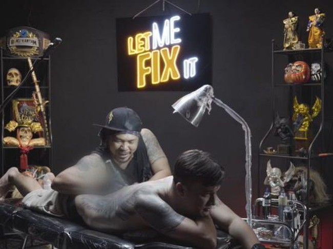 Rendy Kjaernett memang tidak menghapus tato lamanya. Ia memilih untuk menimpa gambar wajah Syahnaz dengan gambar topeng Hannya dari Jepang.
